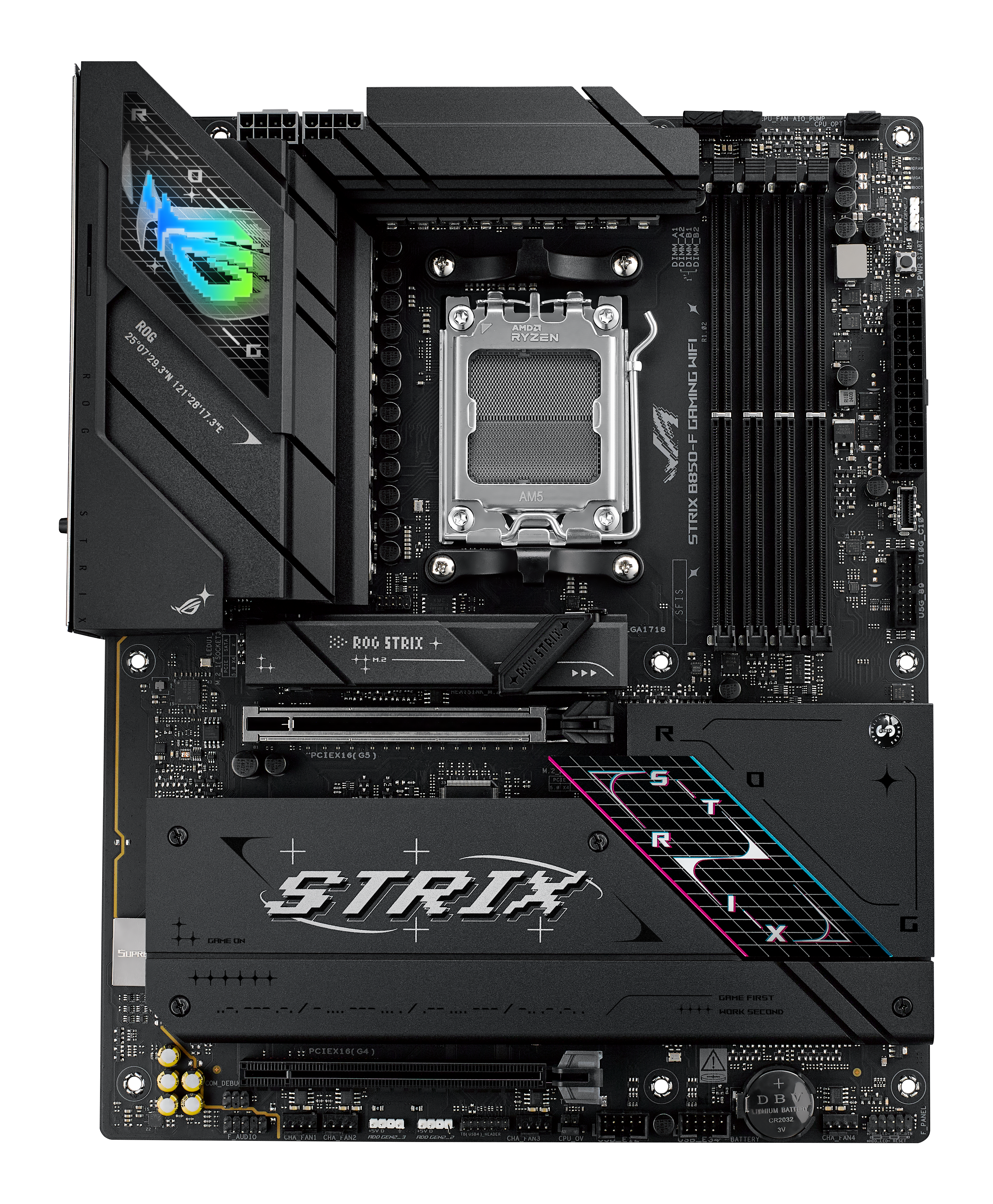 ASUS ROG STRIX B850-F GAMING WIFI. Производител на процесор: AMD, Цокъл за процесор: Socket AM5, Съвместими серии процесори: AMD Ryzen 7000 Series, AMD Ryzen 8000 Series, AMD Ryzen 9000 Series. Поддържани типове памет: DDR5-SDRAM, Максимална вътрешна памет: 192 GB, Тип слотове за памет: DIMM. Поддържани интерфейси за устройства за съхранение: M.2, SATA III, Поддържани типове устройства за съхранение: HDD и SSD, RAID нива: 0, 1, 5, 10. Максимална резолюция: 7680 x 4320 пиксела. Тип Ethernet интерфейс: 2.5 Gigabit Ethernet, Най-добър Wi-Fi стандарт: Wi-Fi 7 (802.11be), Wi-Fi стандарти: Wi-Fi 7 (802.11be)
