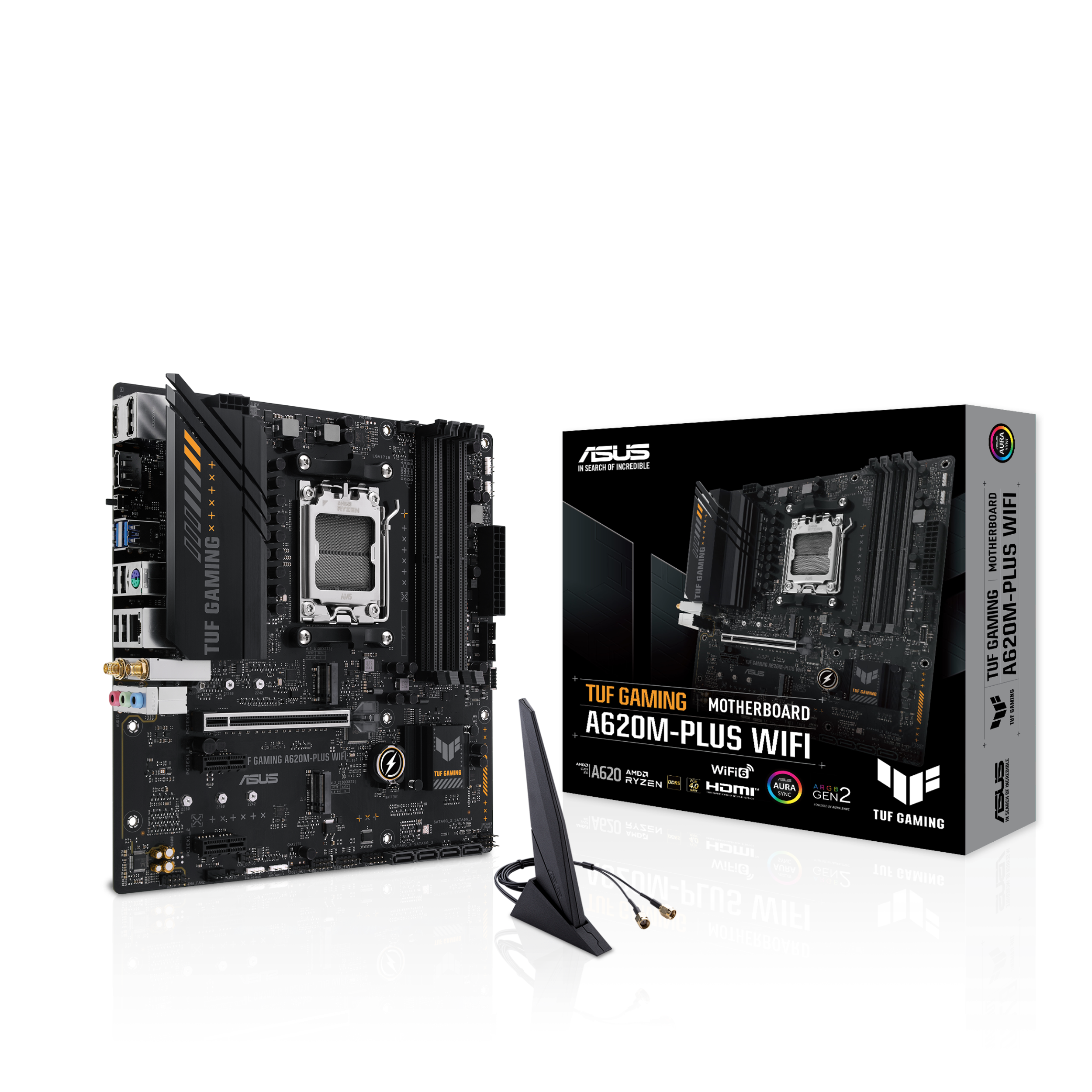 ASUS TUF GAMING A620M-PLUS WIFI. Производител на процесор: AMD, Цокъл за процесор: Socket AM5, Съвместима серия процесори: AMD Ryzen 7000 Series. Поддържани типове памет: DDR5-SDRAM, Максимална вътрешна памет: 128 GB, Канали на паметта: Двуканален. Поддържани интерфейси за устройства за съхранение: M.2, SATA III, Поддържани типове устройства за съхранение: HDD и SSD, RAID нива: 0, 1, 10. Тип Ethernet интерфейс: 2.5 Gigabit Ethernet, Fast Ethernet, Gigabit Ethernet, Най-добър Wi-Fi стандарт: Wi-Fi 6 (802.11ax), Wi-Fi стандарти: 802.11a, 802.11b, 802.11g, Wi-Fi 4 (802.11n), Wi-Fi 5 (802.11ac), Wi-Fi 6 (802.11ax). Компонент за: PC, Форм-фактор на дънната платка: micro ATX, Семейство чипсети на дънната платка: AMD
