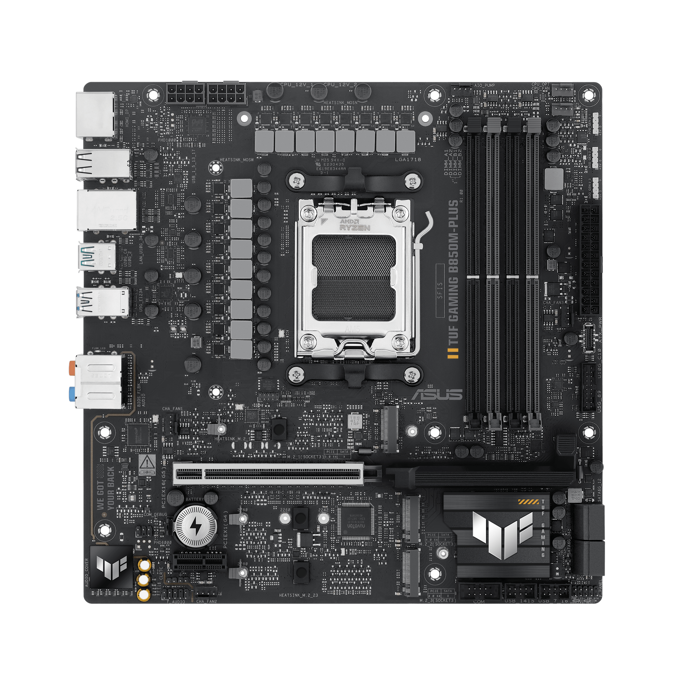 ASUS TUF GAMING B850M-PLUS. Производител на процесор: AMD, Цокъл за процесор: Socket AM5, Съвместими серии процесори: AMD Ryzen 7000 Series, AMD Ryzen 8000 Series, AMD Ryzen 9000 Series. Поддържани типове памет: DDR5-SDRAM, Максимална вътрешна памет: 192 GB, Тип слотове за памет: DIMM. Поддържани интерфейси за устройства за съхранение: M.2, SATA III, Поддържани типове устройства за съхранение: HDD и SSD, RAID нива: 0, 1, 5, 10. Тип Ethernet интерфейс: 2.5 Gigabit Ethernet. Компонент за: PC, Форм-фактор на дънната платка: micro ATX, Семейство чипсети на дънната платка: AMD
