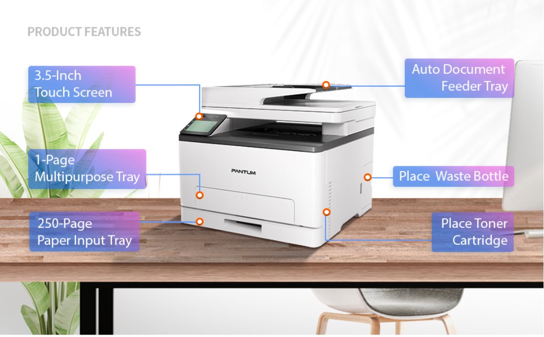 ЦВЕТНО МУЛТИФУНКЦИОНАЛНО УСТРОЙСТВО PANTUM CM1100ADWСкорост на печат – до 18 копия формат A4 / до 19 копия формат Letter за една минутаПърво копие след по-малко от 10,6 секундиТих печатПроцесор – 1GHz Dual CoreПамет 1GBМаксимално месечно натоварване – 30 000 странициADF за 50 странициРазмери – 401 x 411 x 358 ммWifi свързаностВъзможност за мрежова свързаност (чрез мрежови кабел)Съвместим с Windows, Mac OS, Linux