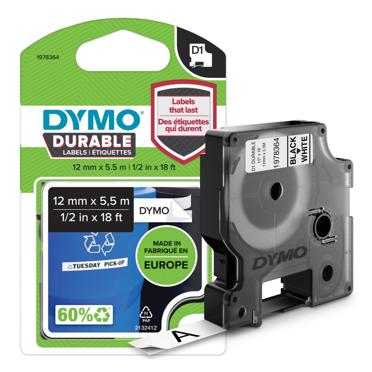 DYMO D1 - Издръжливи етикети - Черен на бял фон - 12 мм x 5,5 м