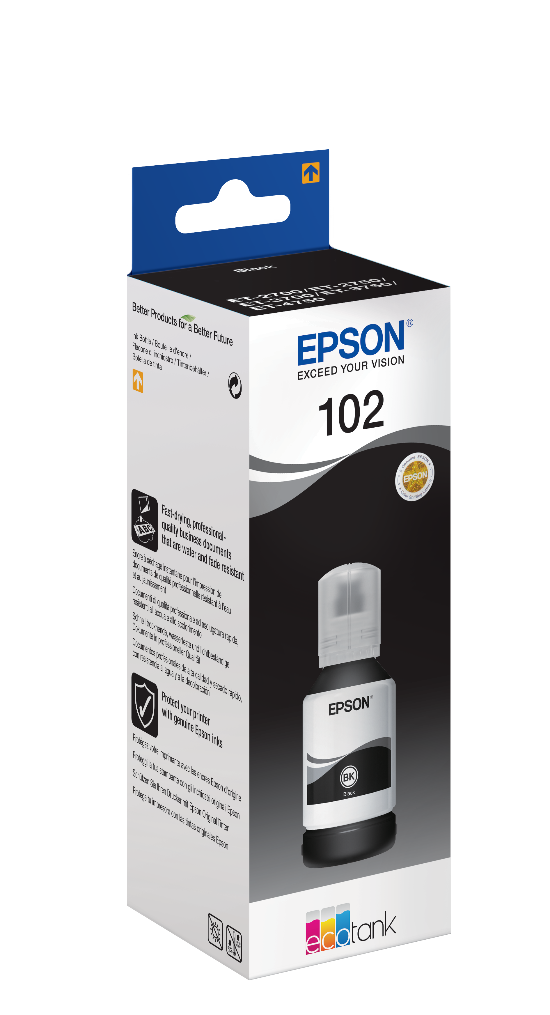 Epson 102 EcoTank Pigment Black ink bottle. Black ink type: Pigment-based ink, Black ink volume: 127 ml, Printing colours: Black, Quantity per pack: 1 pc(s)