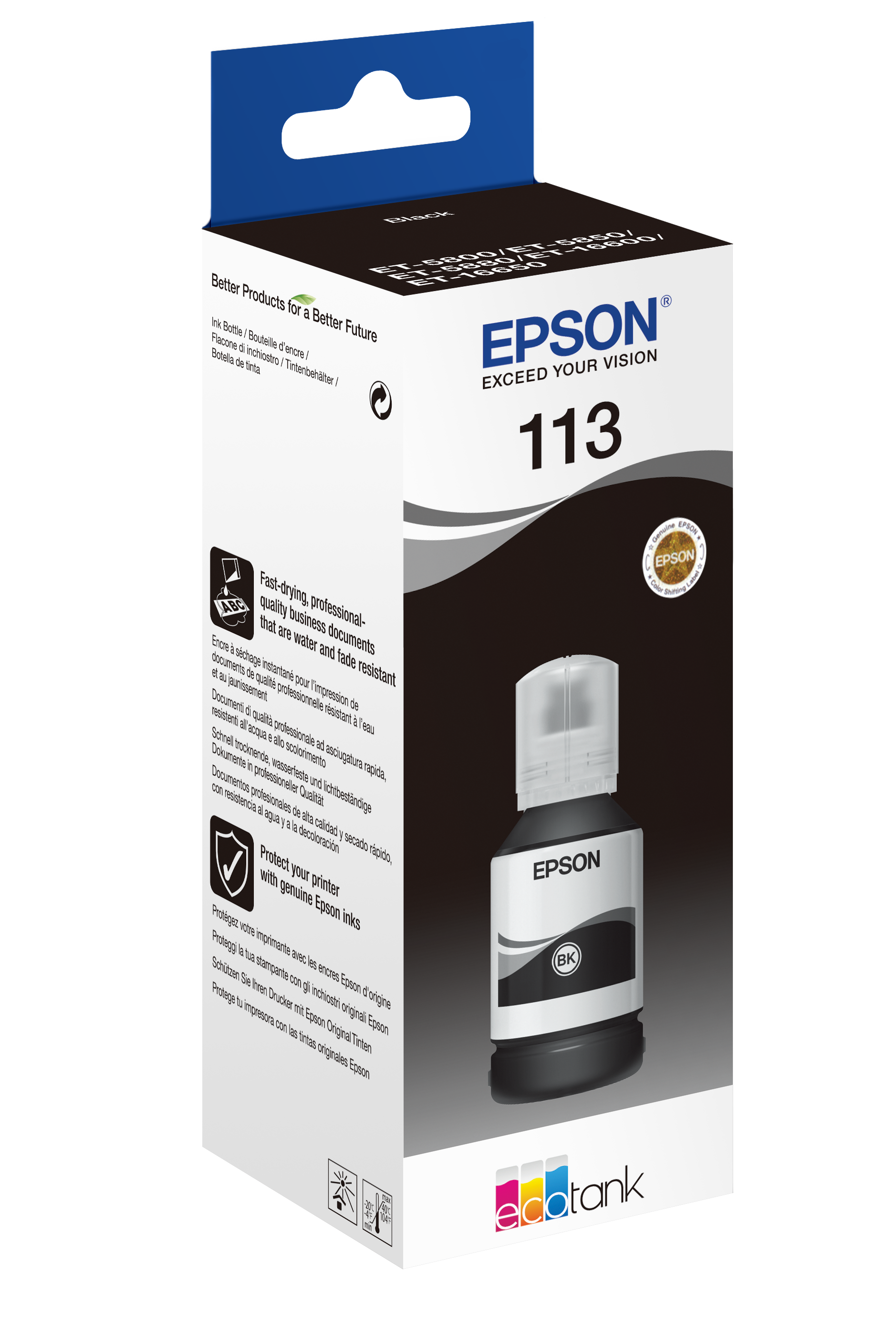 Epson 113 EcoTank. Type: Original, Printing colours: Black, Brand compatibility: Epson. Quantity per pack: 1 pc(s), Package width: 59 mm, Package depth: 175 mm. Master (outer) case length: 480 mm, Master (outer) case width: 310 mm, Master (outer) case height: 150 mm