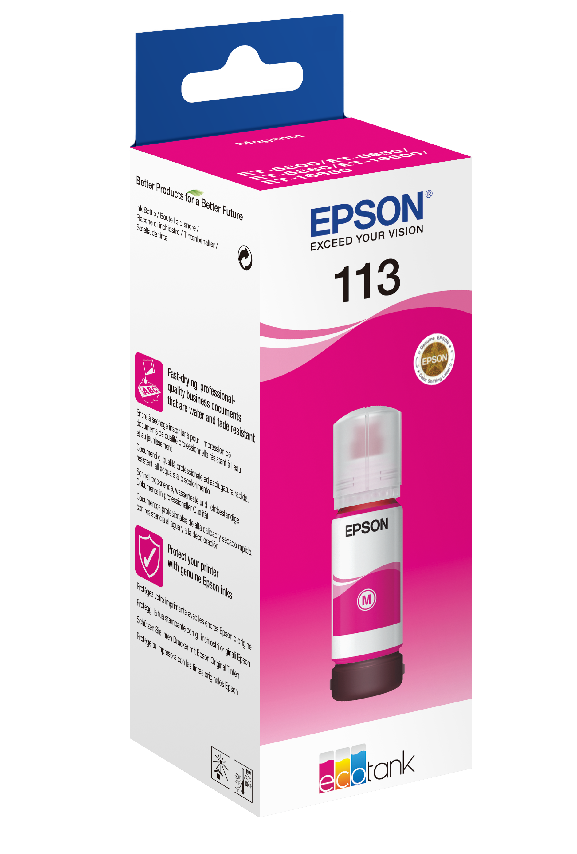 Epson 113 EcoTank. Type: Original, Printing colours: Magenta, Brand compatibility: Epson. Quantity per pack: 1 pc(s), Package width: 59 mm, Package depth: 175 mm. Master (outer) case length: 480 mm, Master (outer) case width: 310 mm, Master (outer) case height: 150 mm