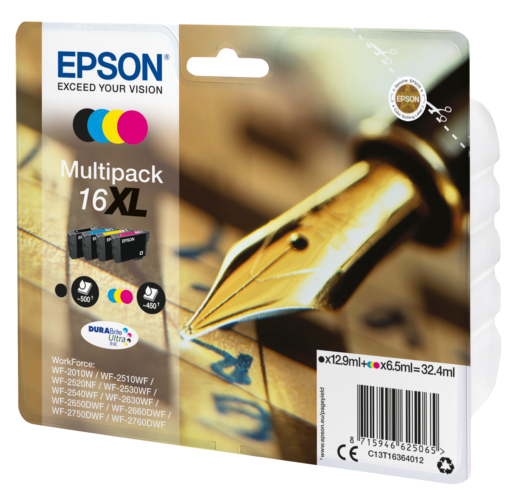 Epson Pen and crossword Multipack 4-colours 16XL DURABrite Ultra Ink. Colour ink type: Pigment-based ink, Cartridge capacity: High (XL) Yield, Black ink type: Pigment-based ink, Black ink volume: 12.9 ml, Supply type: Multi pack, Colour ink volume: 6.5 ml, Printing colours: Black, Cyan, Magenta, Yellow, Quantity per pack: 1 pc(s)