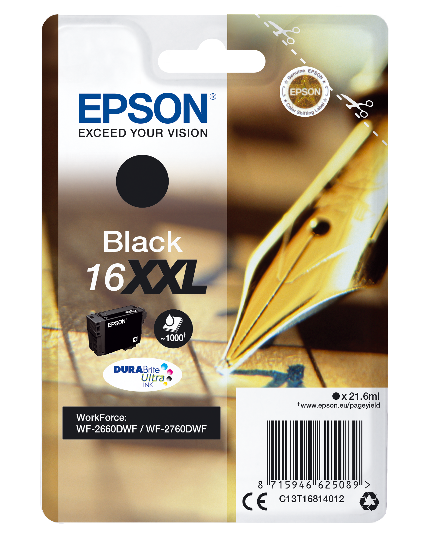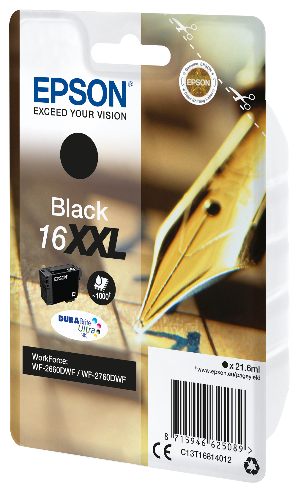 Epson Singlepack Black 16XXL DURABrite Ultra Ink. Cartridge capacity: Extra (Super) High Yield, Black ink type: Pigment-based ink, Black ink volume: 21.6 ml, Printing colours: Black, Quantity per pack: 1 pc(s), Black ink page yield: 1000 pages