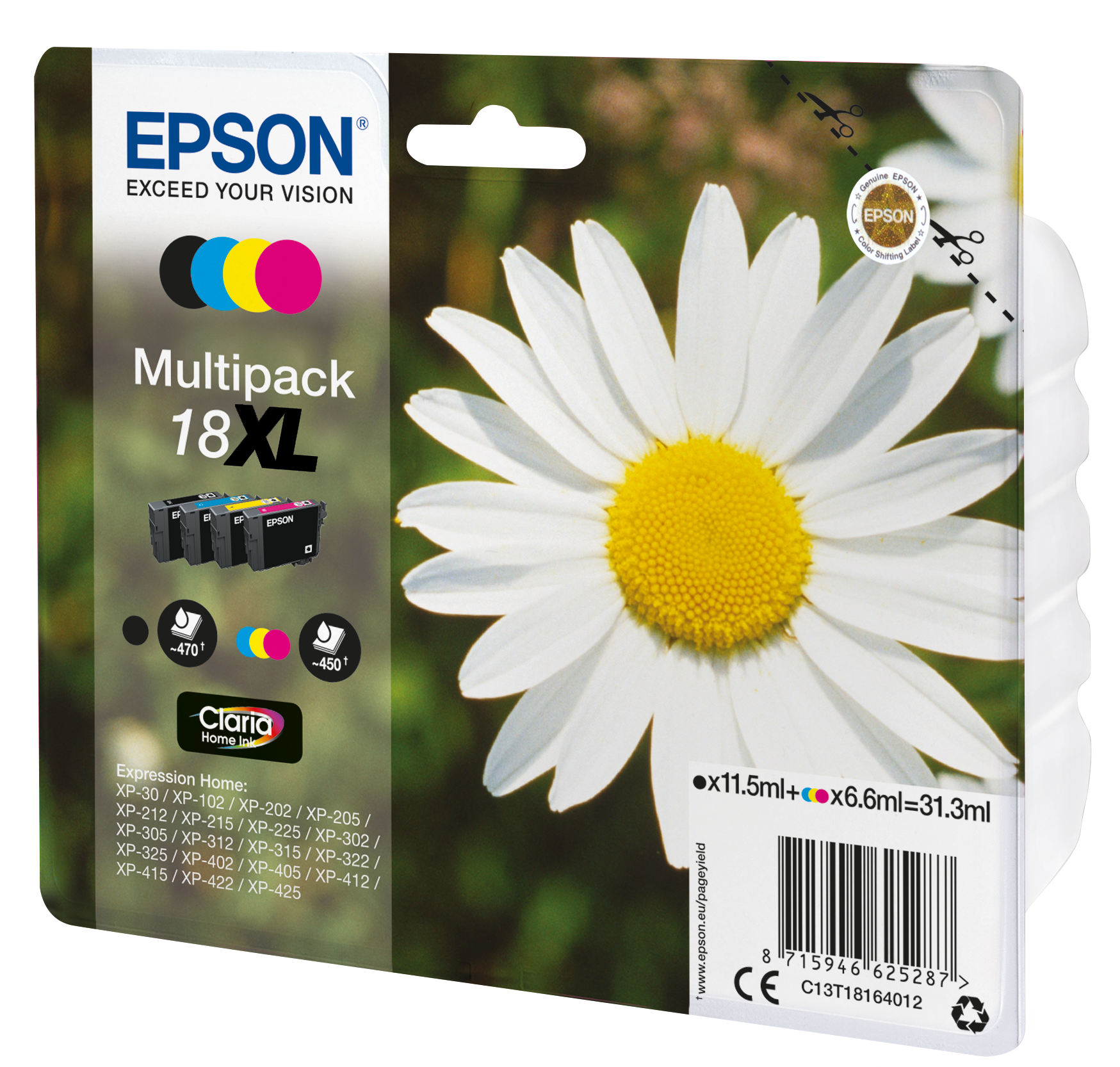 Epson Daisy Multipack 4-colours 18XL Claria Home Ink. Cartridge capacity: High (XL) Yield, Black ink volume: 11.5 ml, Supply type: Multi pack, Colour ink page yield: 450 pages, Colour ink volume: 6.6 ml, Printing colours: Black, Cyan, Magenta, Yellow, Quantity per pack: 1 pc(s), Black ink page yield: 470 pages