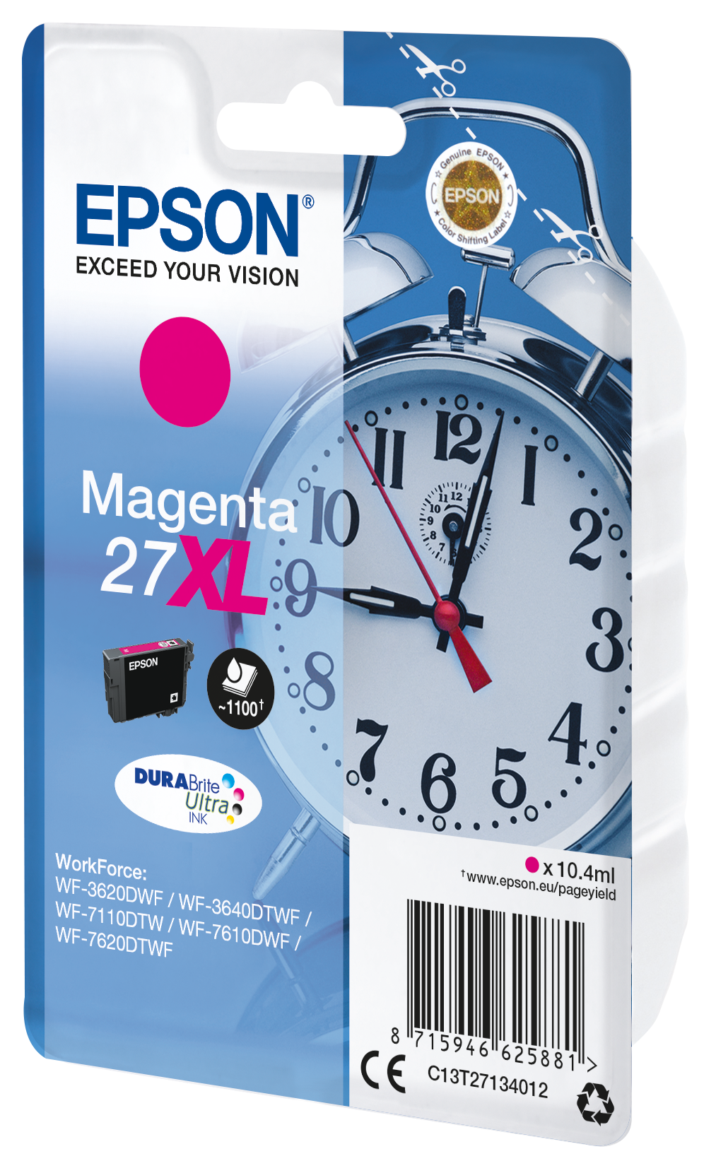 Epson Alarm clock Singlepack Magenta 27XL DURABrite Ultra Ink. Colour ink type: Pigment-based ink, Cartridge capacity: High (XL) Yield, Colour ink page yield: 1100 pages, Colour ink volume: 10.4 ml, Printing colours: Magenta, Quantity per pack: 1 pc(s)