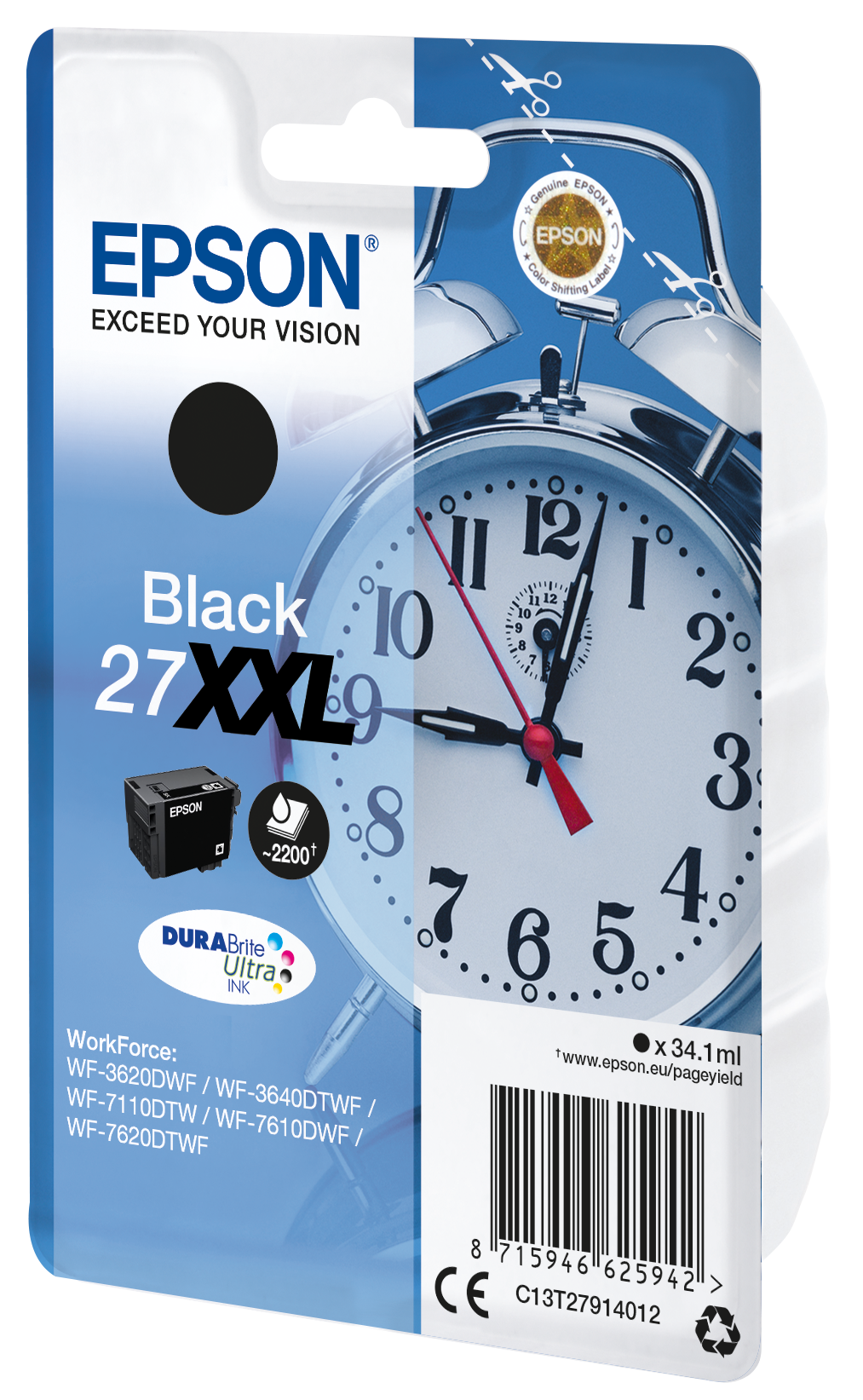 Epson Alarm clock Singlepack Black 27XXL DURABrite Ultra Ink. Cartridge capacity: Extra (Super) High Yield, Black ink type: Pigment-based ink, Black ink volume: 34.1 ml, Printing colours: Black, Quantity per pack: 1 pc(s), Black ink page yield: 2200 pages