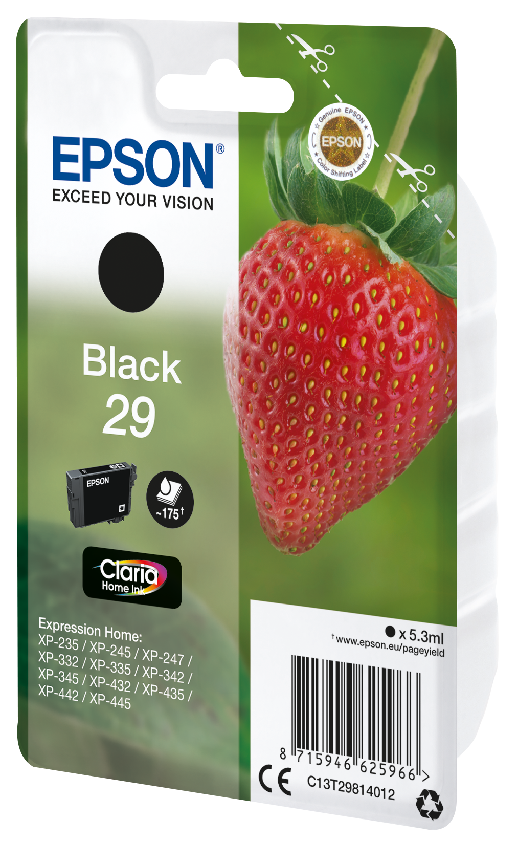 Epson Strawberry Singlepack Black 29 Claria Home Ink. Cartridge capacity: Standard Yield, Black ink type: Pigment-based ink, Black ink volume: 5.3 ml, Printing colours: Black, Quantity per pack: 1 pc(s), Black ink page yield: 175 pages