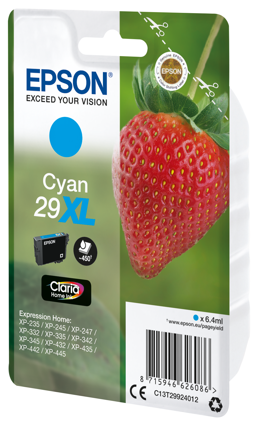 Epson Strawberry Singlepack Cyan 29XL Claria Home Ink. Cartridge capacity: High (XL) Yield, Colour ink page yield: 450 pages, Colour ink volume: 6.4 ml, Printing colours: Cyan, Quantity per pack: 1 pc(s)