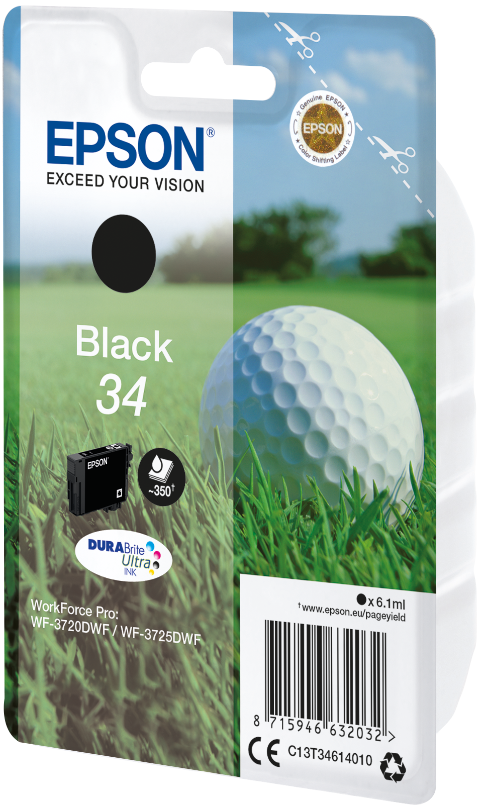 Epson Golf ball Singlepack Black 34 DURABrite Ultra Ink. Cartridge capacity: Standard Yield, Black ink type: Pigment-based ink, Black ink volume: 6.1 ml, Printing colours: Black, Quantity per pack: 1 pc(s), Black ink page yield: 350 pages