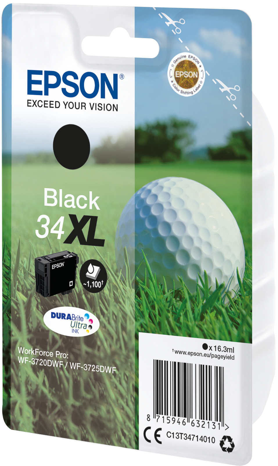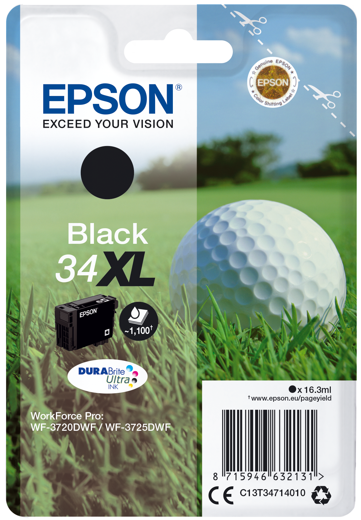 Epson Golf ball Singlepack Black 34XL DURABrite Ultra Ink. Cartridge capacity: High (XL) Yield, Black ink type: Pigment-based ink, Black ink volume: 16.3 ml, Printing colours: Black, Quantity per pack: 1 pc(s), Black ink page yield: 1100 pages