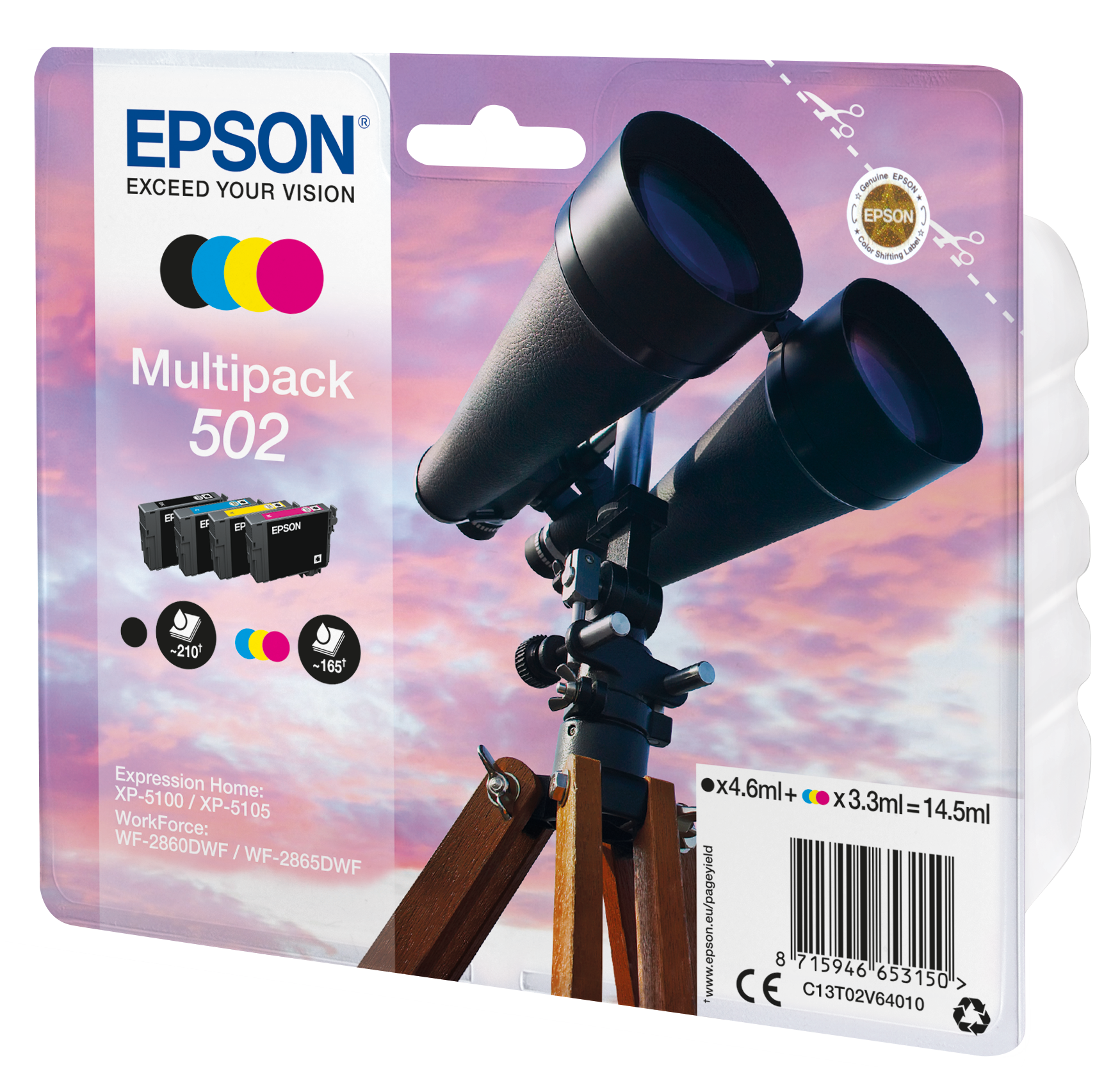 Epson Multipack 4-colours 502 Ink. Colour ink type: Dye-based ink, Cartridge capacity: Standard Yield, Black ink type: Pigment-based ink, Black ink volume: 4.6 ml, Supply type: Multi pack, Colour ink page yield: 165 pages, Colour ink volume: 3.3 ml, Printing colours: Black, Cyan, Magenta, Yellow, Quantity per pack: 1 pc(s), Black ink page yield: 210 pages