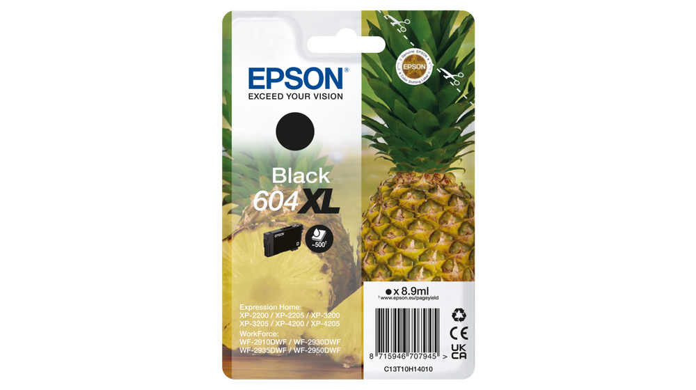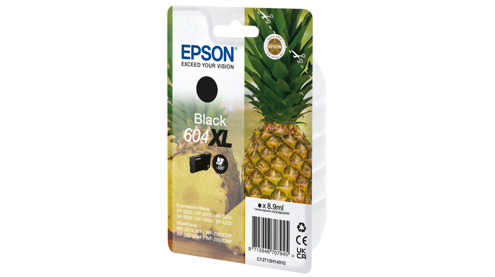 Epson 604XL. Cartridge capacity: High (XL) Yield, Black ink volume: 8.9 ml, Supply type: Single pack, Printing colours: Black, Quantity per pack: 1 pc(s), Black ink page yield: 500 pages