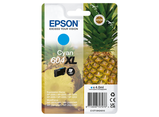 Epson 604XL. Cartridge capacity: High (XL) Yield, Supply type: Single pack, Colour ink page yield: 350 pages, Colour ink volume: 4 ml, Printing colours: Cyan, Quantity per pack: 1 pc(s)