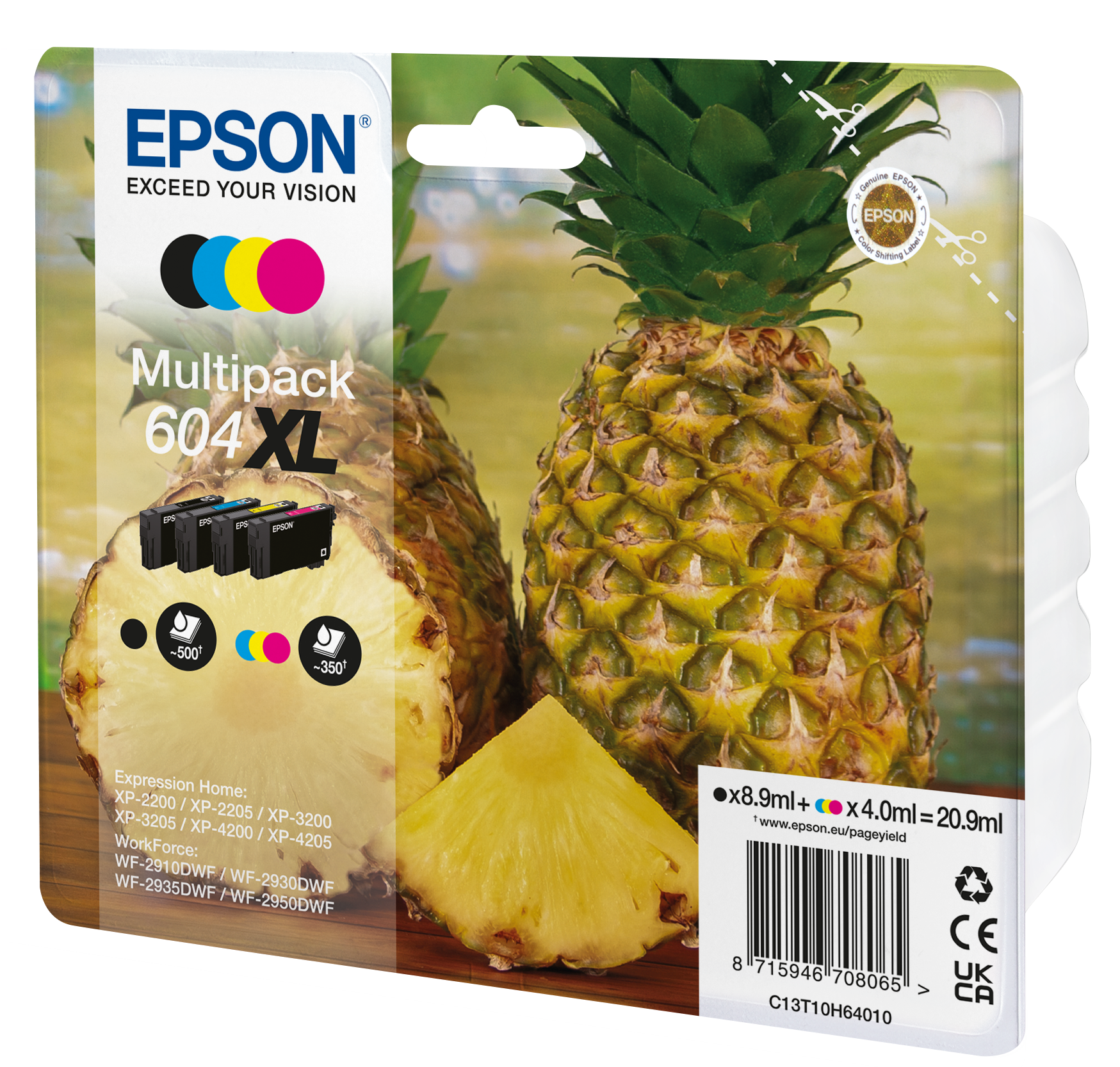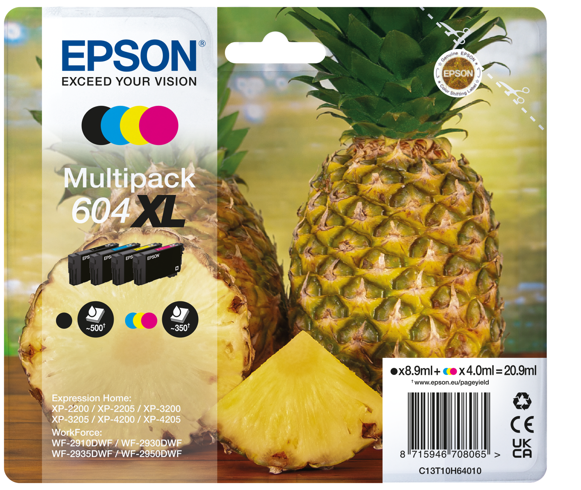 Epson 604XL. Cartridge capacity: High (XL) Yield, Black ink volume: 8.9 ml, Supply type: Multi pack, Colour ink page yield: 350 pages, Colour ink volume: 4 ml, Printing colours: Black, Cyan, Magenta, Yellow, Quantity per pack: 4 pc(s), Black ink page yield: 500 pages