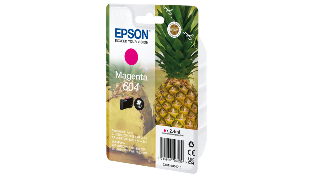 Epson 604. Cartridge capacity: Standard Yield, Supply type: Single pack, Colour ink page yield: 604 pages, Colour ink volume: 2.4 ml, Printing colours: Magenta, Quantity per pack: 1 pc(s)