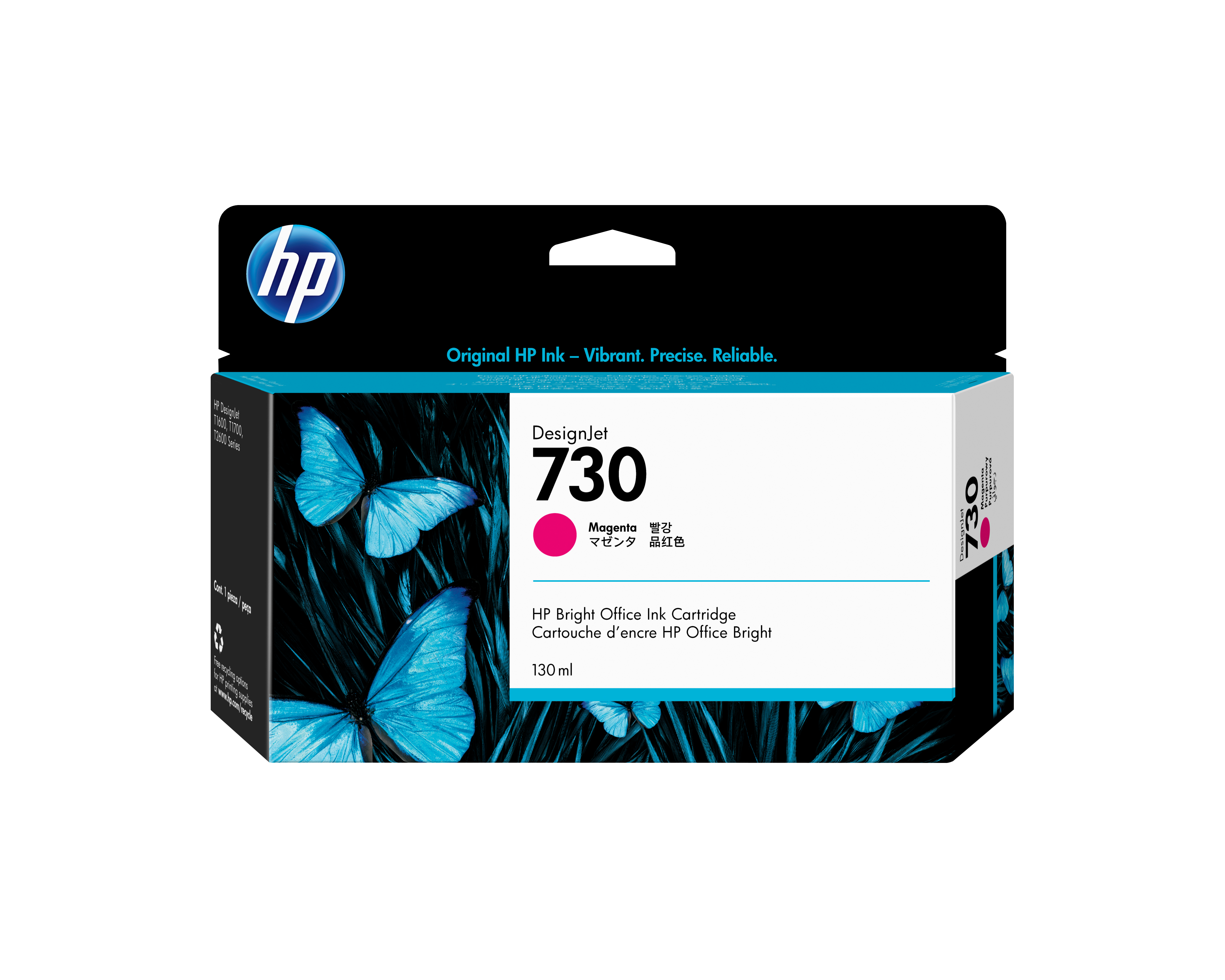 HP 730 130-ml Magenta DesignJet Ink Cartridge. Compatibility: HP DesignJet T1700, Print technology: Thermal inkjet, Printing colours: Magenta. Width: 202 mm, Depth: 129 mm, Height: 40 mm. Package width: 202 mm, Package depth: 129 mm, Package height: 40 mm. Master (outer) cases per pallet: 84 pc(s), Products per pallet: 1680 pc(s), Layers per pallet: 6 pc(s). Pallet dimensions (W x D x H) (imperial): 1016 x 1219.2 x 1501.1 mm (40 x 48 x 59.1"), Pallet weight (imperial): 458.5 kg (1010.8 lbs)