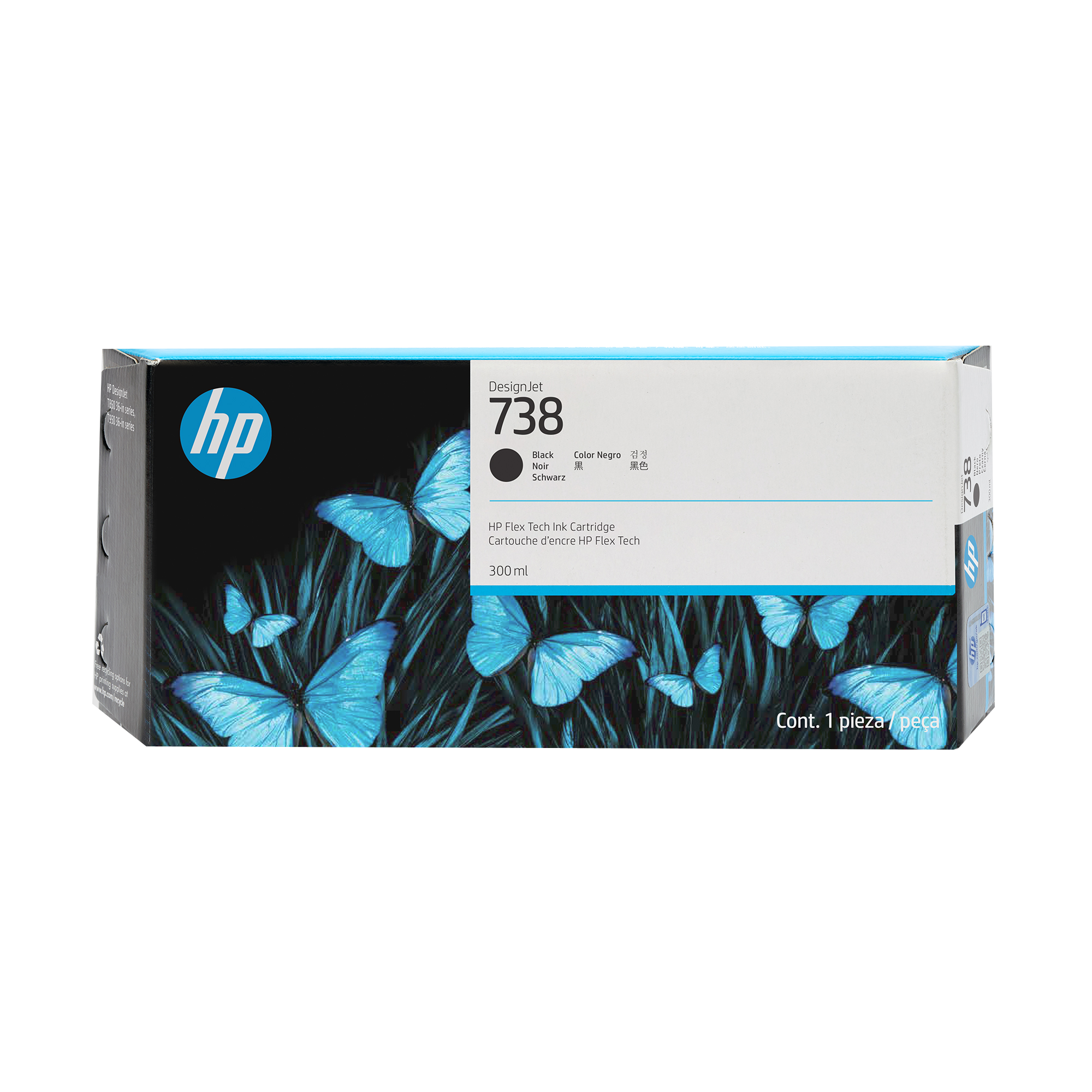 HP 738 300-ml Black DesignJet Ink Cartridge. Compatibility: HP DesignJet T850, T950, Print technology: Thermal inkjet, Printing colours: Black. Width: 283 mm, Depth: 41 mm, Height: 118 mm. Package width: 283 mm, Package depth: 41 mm, Package height: 118 mm. Master (outer) cases per pallet: 102 pc(s), Products per pallet: 510 pc(s), Pallet gross weight: 304.1 kg. Pallet dimensions (W x D x H): 1219 x 1016 x 920 mm, Pallet dimensions (W x D x H) (imperial): 1218.9 x 1016 x 919.5 mm (48 x 40 x 36.2")
