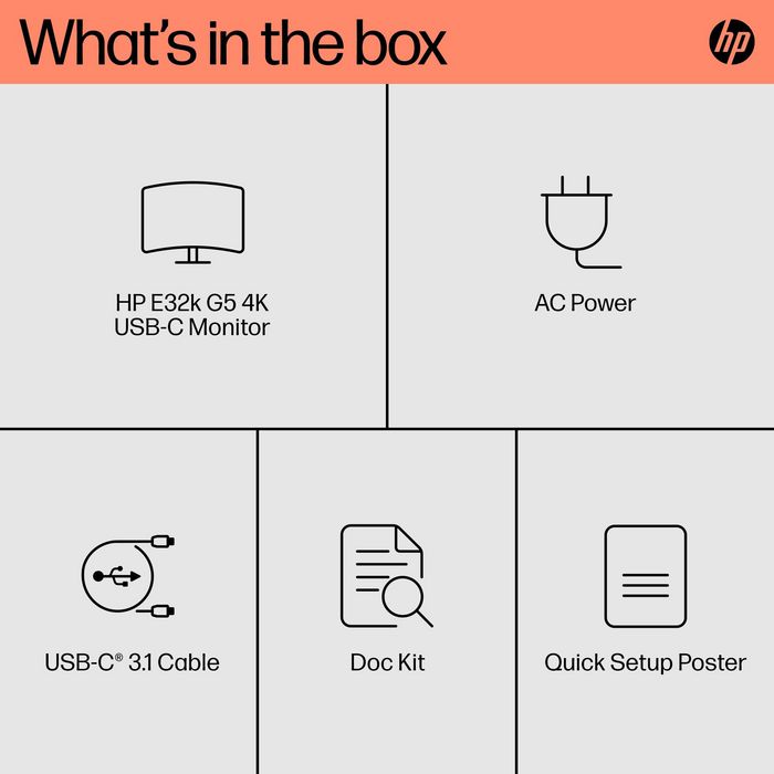 Монитор HP E32k G5 4K USB-C. Диагонал на дисплея: 80 см (31,5"), Резолюция на дисплея: 3840 x 2160 пиксела, HD тип: 4K Ultra HD, Технология на дисплея: LCD, Повърхност на дисплея: Матова, Време за реакция: 5 мс, Съотношение на страните: 16:9, Ъгъл на гледане, хоризонтален: 178°, Ъгъл на гледане, вертикален: 178°. Вградени високоговорители. Вграден USB хъб, Версия на USB хъба: 3.2 Gen 1 (3.1 Gen 1). VESA монтаж, Регулиране на височината. Цвят на продукта: Черен