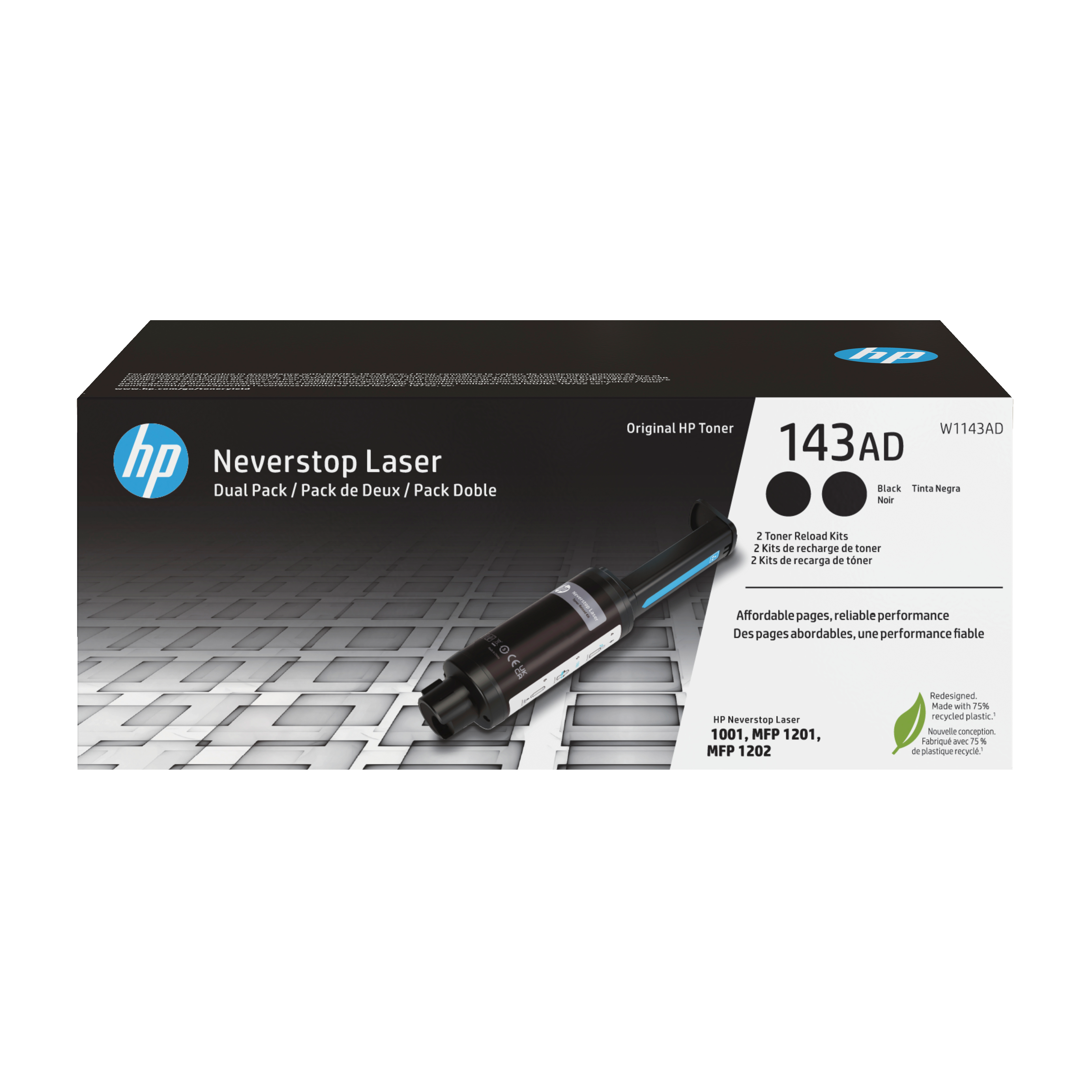 HP 143AD Dual Pack Black Original Neverstop Toner Reload Kit. Black toner page yield: 2500 pages, Printing colours: Black, Quantity per pack: 2 pc(s)