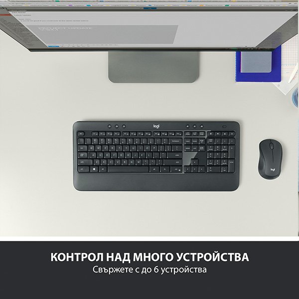 Комплект клавиатура и мишка Logitech MK540 Advanced, безжичен, черен - PN 920-008685, Без кирилица!Logitech MK540 Advanced е комбинация от безжична клавиатура и мишка, създадени за точност, комфорт и надеждност. Клавиатурата е пълен размер, а ергономичната мишка е подходяща за използване както с дяска, така и с лява ръка.Клавишите са оптимизирани за максимална прецизност и по-малко шум, а безжичната мишка с ергономична форма приляга перфектно към ръката си. Благодарение на отличното управление на енергията, MK540 Advanced Set ще остане активен дълго време!Прецизно писане: Мигновено познато изживяване, пишете с лекота и комфорт на тази пълноразмерна безжична клавиатура, включваща намален шум, опора за дланта, дизайн, устойчив на разливане, регулируеми наклонени кракаСъздадена за комфорт: Елегантната безжична мишка се отличава с двойна форма и меки гумени странични дръжки, които пасват удобно в дланта ви, както и подобрено проследяване и прецизен контрол на курсораДълготрайна автономност: Комплектът безжична клавиатура и мишка се доставя с дълготраен живот на батерията, като клавиатурата издържа до 36 месеца, а безжичната мишка до 18 месецаПерсонализирано управление: Подобрена производителност на върха на пръстите ви, компютърната клавиатура е изградена с удобни, основни клавишни комбинации, осигуряващи директен достъп до медии, калкулатор, функции за проверка на батериятаБезжична свобода: Включете и пуснете вашата мишка и клавиатура с мини Logitech Unifying USB приемник за надеждна безжична връзка до 10 м от вашия компютър или лаптопСъвместимост: Тази комбинация от безжична клавиатура и мишка на Logitech е съвместима с Windows 10 или по-нова версия, Windows 8, Windows 7, ChromeOS