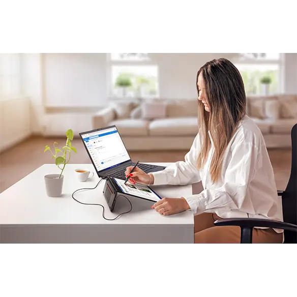 Lenovo ThinkVision M14t Gen 2 - LED монитор - 14" - преносим - сензорен екран - 2240 x 1400 @ 60 Hz - IPS - 300 cd/m² - 1500:1 - 6 ms - 2xUSB-C - гарваново черенПреносим дизайнLenovo ThinkVision M14t Gen 2 се откроява със своя преносим форм-фактор, което го прави идеален спътник за професионалисти в движение. Лекият му дизайн и интегрираната система за управление на кабелите осигуряват безпроблемно работно място, където и да сте.Изключително визуално качествоНасладете се на ярка, ясна картина и широк спектър от цветове с 14-инчовия дисплей с резолюция 2240 x 1400 на монитора. Със 100% покритие на sRGB цветовата гама, 16,7 милиона цвята и WLED технология за подсветка, този монитор предоставя зашеметяващи визуализации за всяко съдържание.Подобрени функции за производителностС функции като 10-точков мултитъч сензор, регулиране на височината, завъртането и наклона, Lenovo ThinkVision M14t Gen 2 повишава производителността. Неговото динамично контрастно съотношение от 3000000:1, съчетано с време за реакция от 6 ms, осигурява плавна и бърза употреба, което го прави идеален за многозадачност и интерактивни задачи.Цялостна свързаностТози монитор предлага разнообразни опции за свързване с двата си USB-C порта, поддържащи DisplayPort 1.2 и Power Delivery до 65 W. Това позволява лесно свързване към различни устройства, като същевременно поддържа работното ви място подредено и организирано.