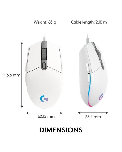 Гейминг мишка Logitech G102 Lightsync, оптична, жична, RGB, бяла - PN 910-0058248000 DPI сензорСъздаден специално за гейминг, за да може прецизно да отчита всяко ваше движение в играта. Изберете подходящия DPI за вас, чрез Logitech G HUB гейминг софтуера и превключвайте лесно между цели 5 профила за DPI.Супер ярка LIGHTSYNC RGB подсветкаИзберете своя стил и цвят измежду 16,8 милиона цвята, както и актуални ефекти. Инсталирайте Logitech G HUB софтуера, за да изберете от предварително зададените цветове или анимации, или създайте свои собствени.Класически, тестван гейминг дизайнLogitech Усетете комфорта и абсолютния контрол върху мишката. Изпитана във времето, класическата форма на Logitech G102 разполага с 6 перфектно разположени бутона, което я прави супер удобна и предпочитана от геймърите. Всеки от бутоните може да бъде програмиран чрез Logitech G HUB софтуера изключително лесно.Механични суичове на основните бутониСпециална система с деликатна пружина е вградена във всеки от двата основни бутона на мишката, за да ви гарантира точни, отчетливи и супер бързи кликове. Насладете се на отлична прецизност и се забавлявайте максимално.