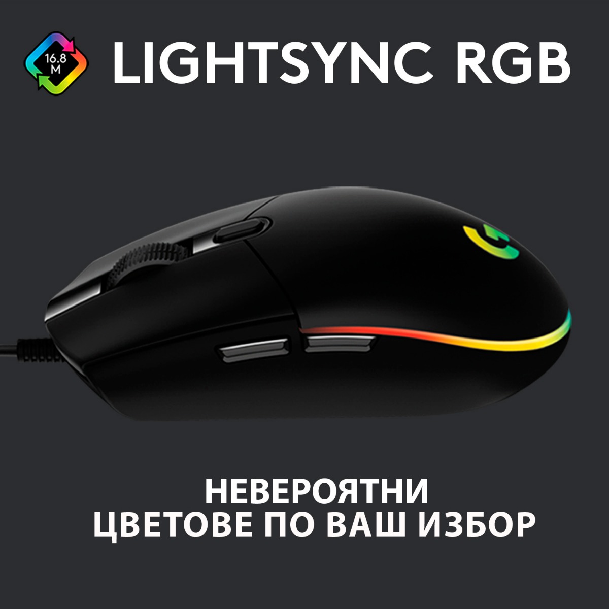 Гейминг мишка Logitech G102 Lightsync, оптична, черна, с RGB подсветка - PN 910-005823Характеристики:Тип сензор: ОптиченМодел сензор: Logitech "gaming grade"Чувствителност: 200 - 8,000 DPIЧестота на изпращане на данните: 1,000 Hz / 1 милисекунда32 битов ARM микропроцесорШест програмируеми бутонаLogitech Lightsync RGB подсветка с 16.8 милиона цвятаРазлични режими на работа на подсветкатаОпция за синхронизация на подсветката с други устройства LightsyncДължина: 116.6 ммШирина: 62.15 ммДълбочина: 38.2 ммТегло: 85 грама без кабелаДължина на кабела: 2.1 метраLogitech G Hub софтуер за настройки и персонализацияГаранция: 24 месеца