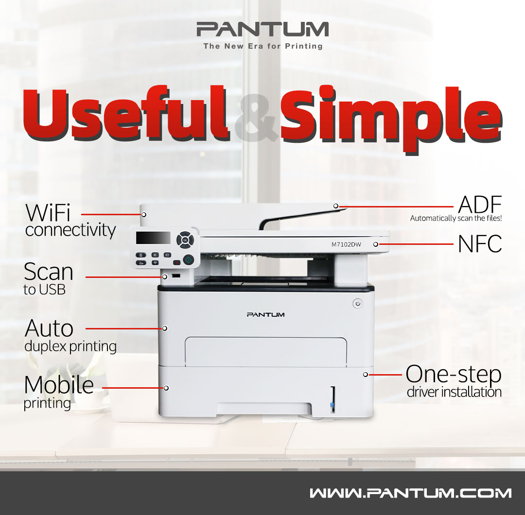 МУЛТИФУНКЦИОНАЛНО ЛАЗЕРНО УСТРОЙСТВО PANTUM M7100DW Характеристики:3 in 1: печат, копиране и сканиранеСкорост на печат – до 33 копия формат A4 / до 35 копия формат Letter за една минутаПърво копие след по-малко от 8,2 секундиLCD панел за контрол на работатаАвтоматичен ДУПЛЕКС печатСпецифични, улесняващи потребителя функции: AIRPRINT, MOPRIA, NFC. ANDROID/iOS APPs за мобилни устройстваОтделни (разделени) консумативи – тонер и барабан, позволяващи на собственика да управлява CAM разходите, в зависимост от ритъма на работата сиПроцесор – 525 MhzПамет 256 MBМаксимално месечно натоварване – 60 000 странициРазмери – 415 x 365 x 350 ммТегло – 10,46 кгWiFi свързаностВъзможност за мрежова свързаност (чрез мрежови кабел)Съвместим с Windows, Mac OS, Linux