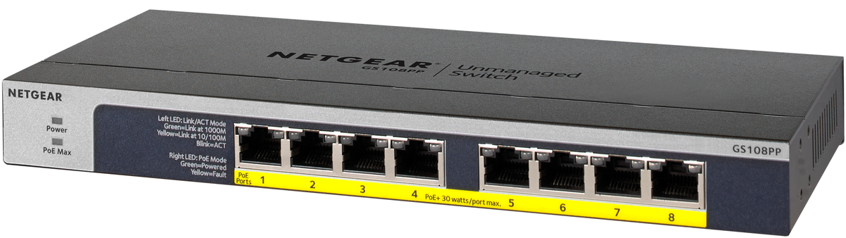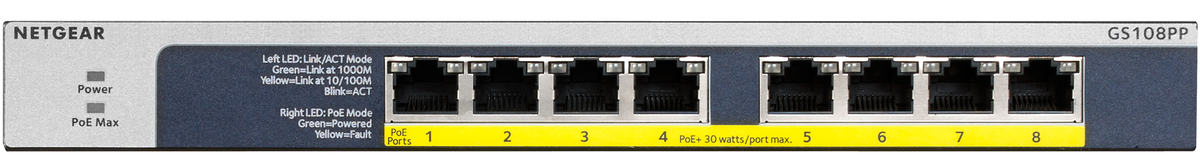 NETGEAR GS108PP - Комутатор - 8 x 10/100/1000 (PoE+) - настолен, за монтаж в шкаф, за монтаж на стена - PoE+ (123 W) - DC захранване