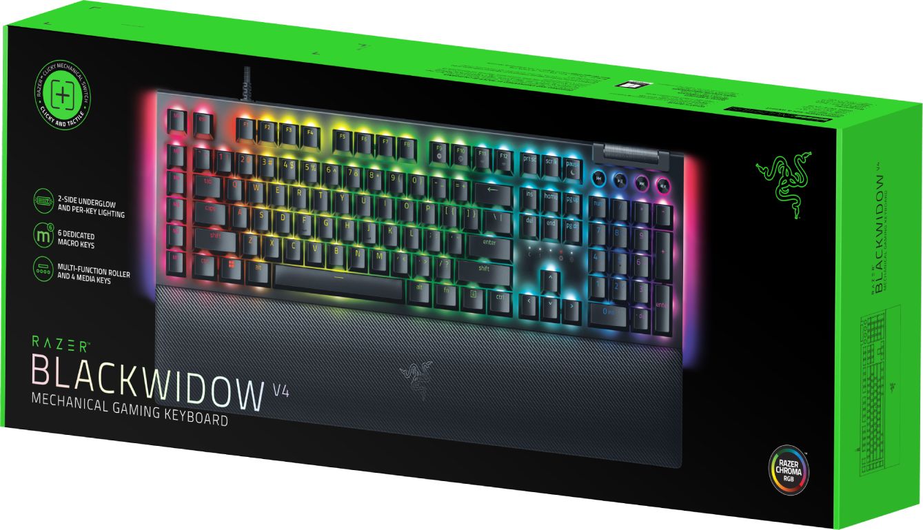 Гейминг клавиатура Razer BlackWidow V4 - Клавиатура - с подсветка - USB-C - US - клавишен превключвател: Razer GreenТази клавиатура е известна със своите разширени функционалности и възможности за персонализация:Тип на суичовете: Използва механични суичове на Razer, като потребителите обикновено могат да избират между:Razer Green Mechanical Switches (щракащи и осезаеми)Razer Yellow Mechanical Switches (бързи и тихи, линейни)Свързване: Кабелна, с възможност за преходен USB порт (USB Pass-through) за удобно свързване на други устройства.Пълна RGB подсветка: Оборудвана е с индивидуално програмируема Razer Chroma RGB подсветка, включително подсветка под шасито.Допълнителни контроли:Макро бутони (Macro Keys): Разполага с пет специални макро бутона от лявата страна за бързо изпълнение на команди.Команден циферблат Razer (Razer Command Dial): Това е програмируем въртящ се циферблат в горния ляв ъгъл, който може да се настройва за управление на звука, увеличаване/намаляване на мащаба или изпълнение на други персонализирани функции.Мултимедийни бутони: Специализирани ролки и бутони за управление на мултимедията.Опора за китките: Включва магнитна, плюшена опора за китките (magnetic plush leatherette wrist rest) за повишен комфорт при продължителна игра.