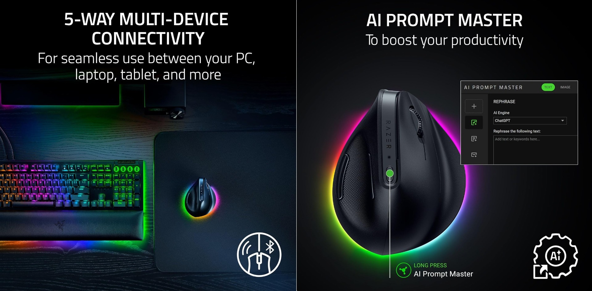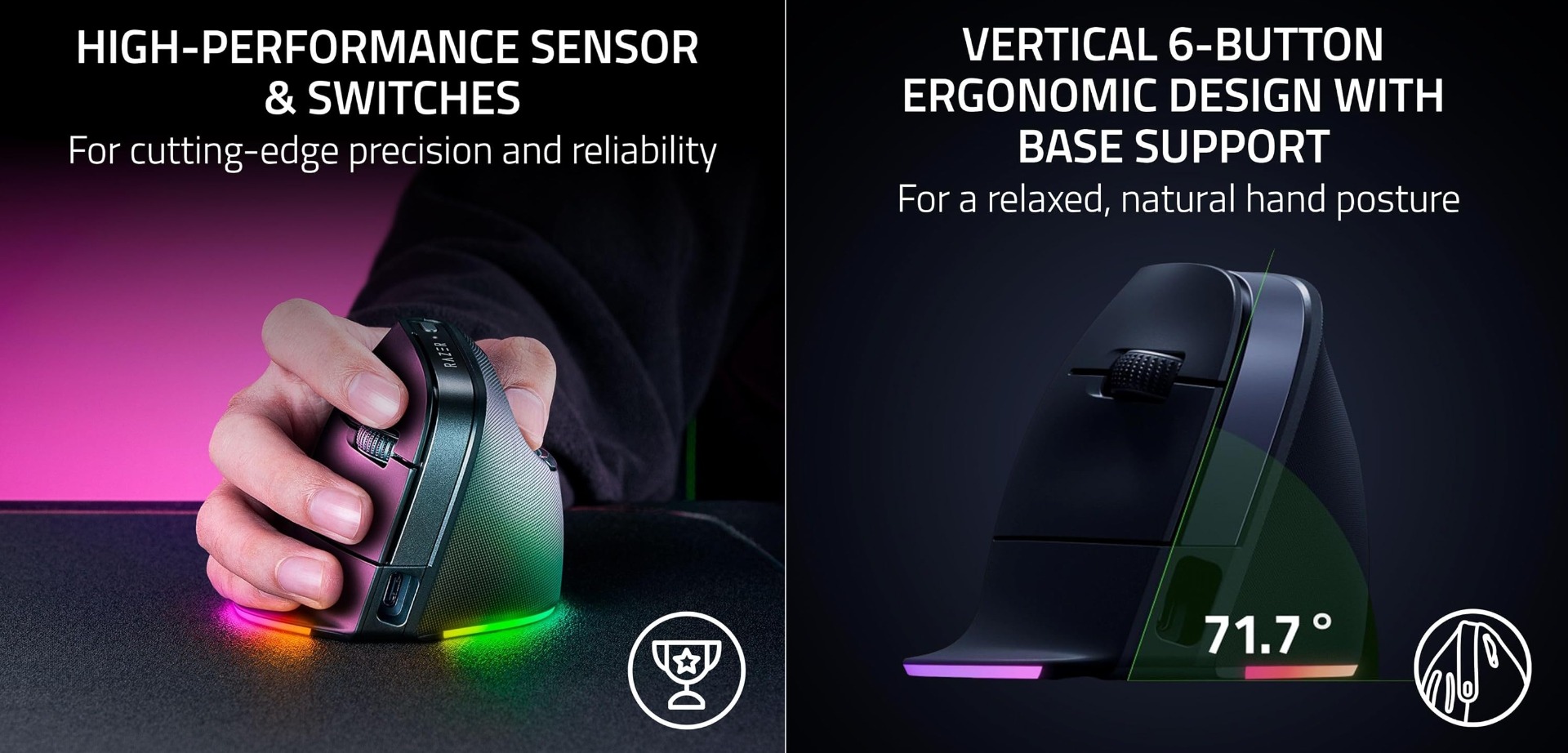 Razer Pro Click V2 Vertical Ed. Ергономична вертикална безжична мишкаЕргономичен дизайн сопора за основа.Проектирана за естествен захват като при стискане на ръката, ъгловата ѝ форма осигурява комфорт по време на продължителни игри или работни сесии, а опората на основата намалява триенето в киткатаДо 8 програмируеми бутона.Вертикалният дизайн за десничари намалява напрежението и умората на китката и предмишницата. С вградени профили с памет за запазване на персонализирани настройки.