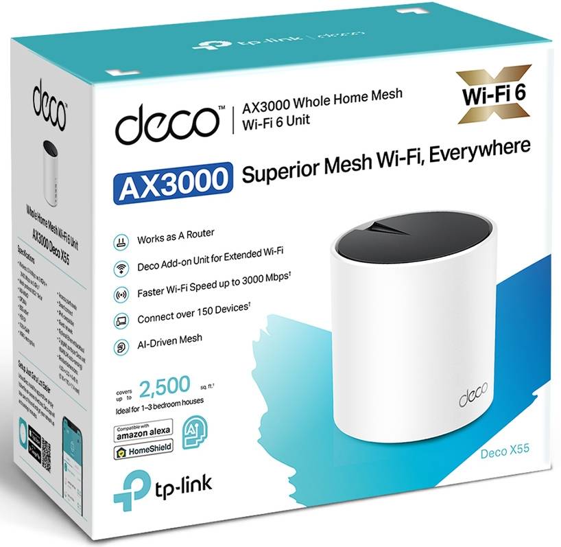 TP-Link Deco X55. Цвят на продукта: Черен, Бял, Тип антена: Вътрешна. Wi-Fi честотна лента: Двубандова (2.4 GHz / 5 GHz), Най-висок Wi-Fi стандарт: Wi-Fi 6 (802.11ax), Wi-Fi стандарти: 802.11a, 802.11b, 802.11g, Wi-Fi 4 (802.11n), Wi-Fi 5 (802.11ac), Wi-Fi 6 (802.11ax)