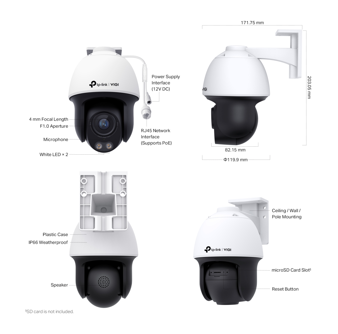 TP-Link VIGI C540S(4 мм). Тип: IP охранителна камера, Поддържано разположение: На закрито и на открито, Технология на свързване: Кабелна. Тип монтаж: Таван/стена, Цвят на продукта: Черен, Бял, Форм фактор: Куполен. Ъгъл на видимост на обектива, хоризонтален: 104°, Ъгъл на видимост на обектива, вертикален: 55°, Ъгъл на видимост на обектива, диагонал: 127°. Тип сензор: CMOS, Размер на оптичния сензор: 25.4 / 3 мм (1 / 3"). Разстояние на откриване: 63 м, Разстояние на наблюдение: 26 м, Разстояние на разпознаване: 13 м