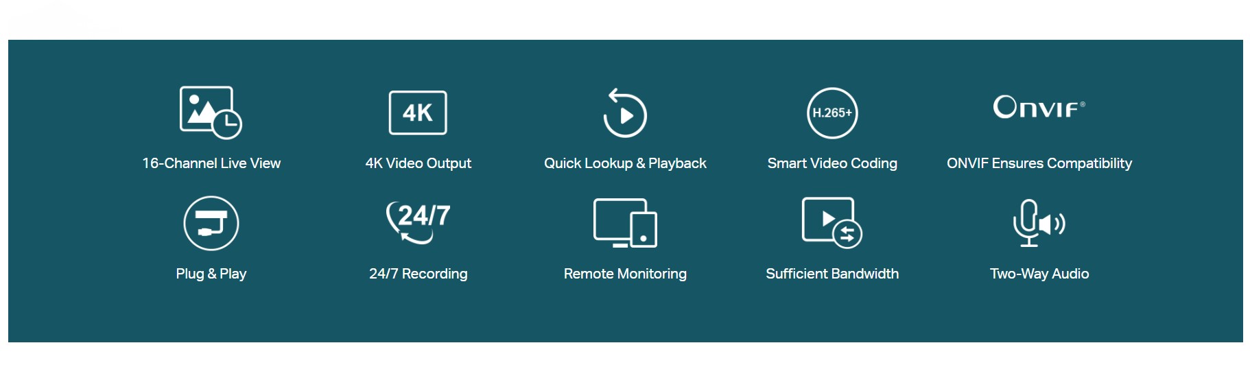TP-Link VIGI NVR2016H. Входни видео канали: 16 канала, Максимална резолюция: 3840 x 2160 пиксела, Брой едновременно възпроизвеждани канали: 16 канала. Максимален капацитет за съхранение: 10 TB, HDD интерфейс: SATA. Скорости на пренос на данни през Ethernet LAN: 10 100 Mbit/s, Поддържани мрежови протоколи: UPnP (Plug and Play), NTP (Network Timing). Цвят на продукта: Черен, Сертификация: CE, EAC, UKCA, RCM, Triman, BSMI, VCCI, FCC, IC, HDMI. Консумирана мощност (макс.): 24,16 W, Изходен ток: 3,3 A, Изходно напрежение: 12 V16-канален преглед на живо и 4K HDMI видео изходВъзможност за декодиране до 10 канала при 1080P (25 кадъра в секунда)16-канално синхронно възпроизвеждане †160 Mbps входяща и изходяща честотна лента2× SATA интерфейса и 1 до 16 TB*Технология за компресия H.265+Вход/изход за аларма: 6/4Независим HDMI и VGA изходДистанционно наблюдение