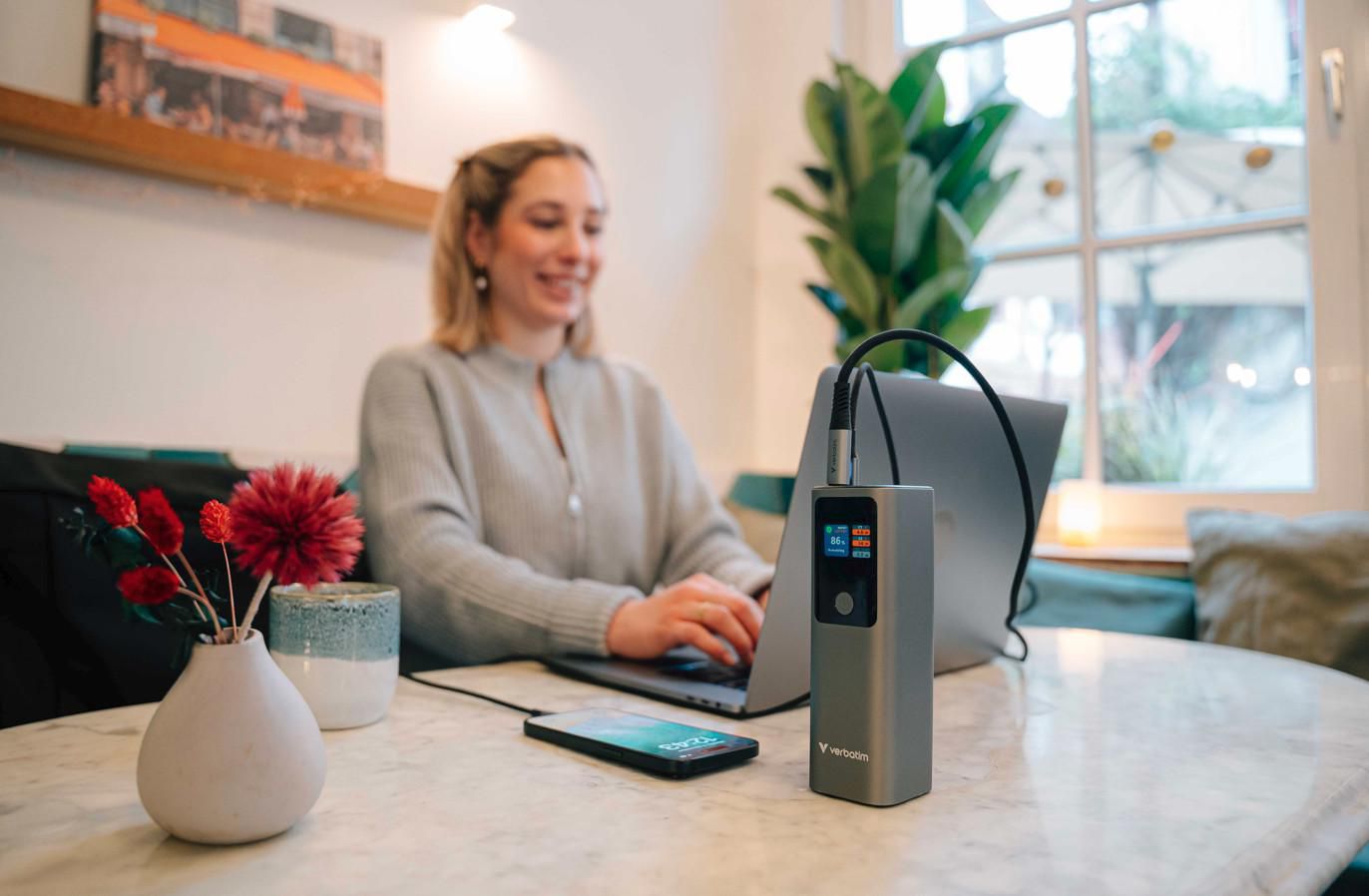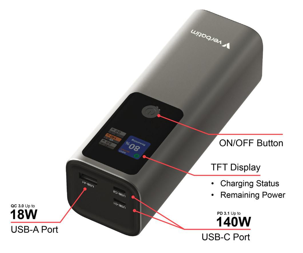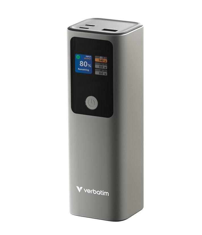 Verbatim Charge 'n' Go - Безжична външна батерия - магнитно закрепване - 27000 mAh - 65 Watt - Бързо зареждане - 3 изходни конектора (24-пинов USB-C) - сиваОгромен капацитет от 27 000 mAh, идеален за лаптопи, смартфони и таблетиДва USB-C® порта , поддържащи бързо зареждане PD 3.1 до 140WUSB-A порт с QC 3.0, осигуряващ до 18W за допълнително зареждане на устройстваЗареждайте до три устройства едновременноИнтелигентен цифров TFT дисплей, показващ нивата на мощност и състоянието на зарежданеДвупосочен USB-C порт за опростено зарежданеВградени системи за безопасност: защита от свръхток, късо съединение, презареждане, преразреждане и прегряване